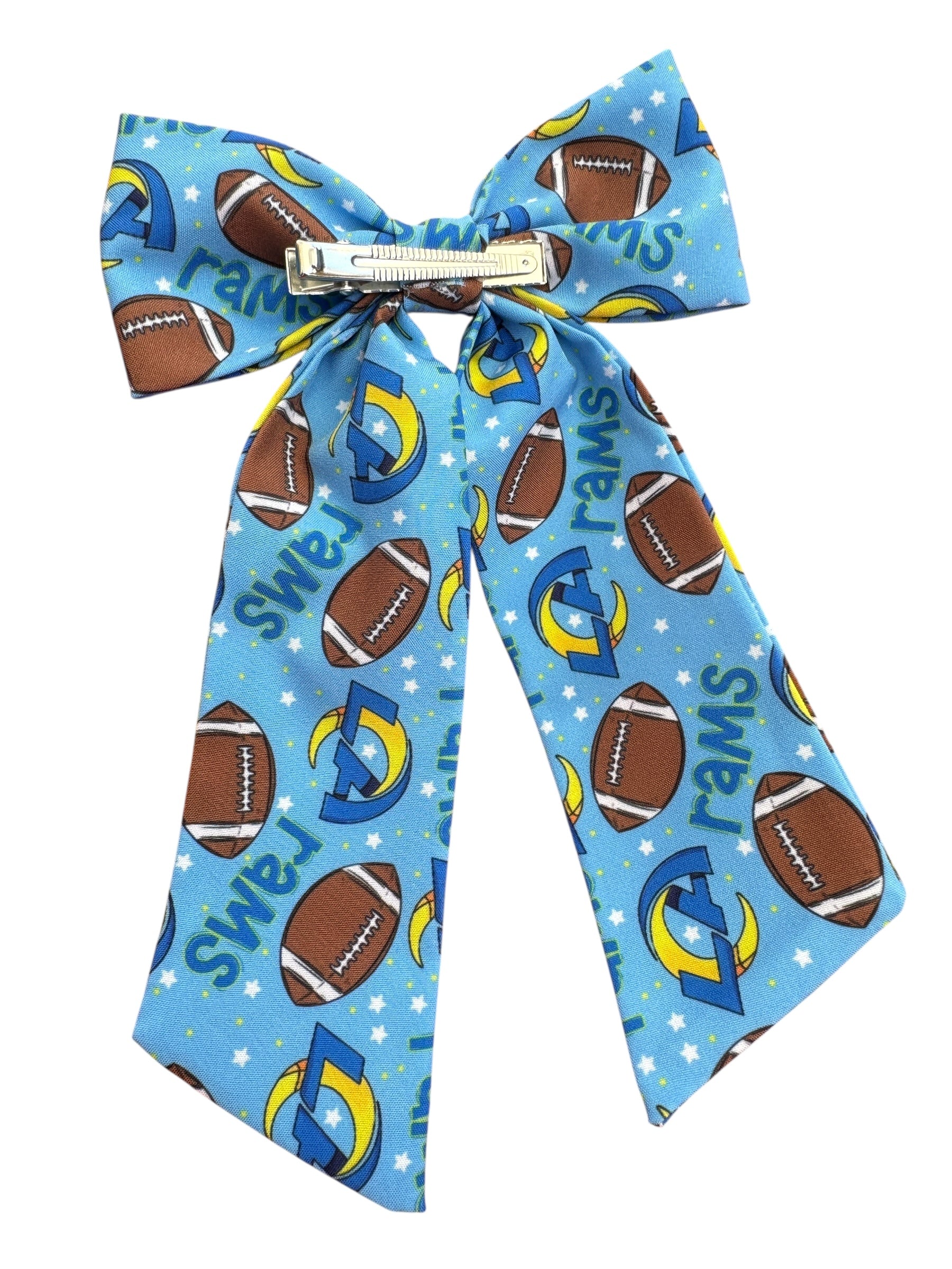 Cheer on your team in style with our LA Rams Hair Bows, the perfect game day accessory for little fans and big fans alike! Designed in bold blue, yellow, and football patterns, these bows add the ultimate pop of spirit to any outfit.
