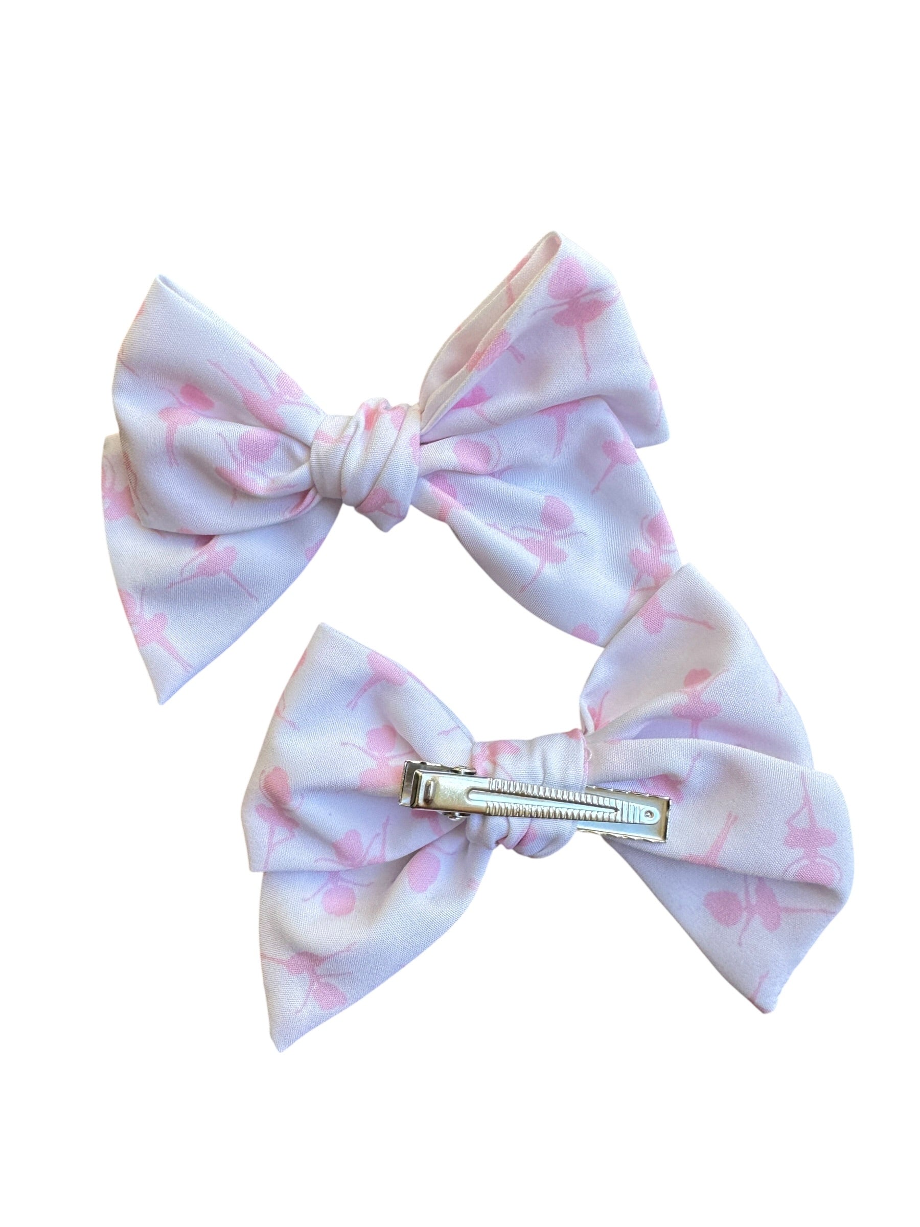 These whimsical ballerina hair bows are perfect for aspiring dancers, ballet class, dance recitals, or any little one who loves the beauty of ballet. The charming ballerina design adds a touch of dance-inspired elegance to any outfit, whether it's a tutu for dance class or everyday wear. Choose the large 5" bow to make a bold statement or the small 4" bow for a more delicate touch. Perfect for pigtails, ponytails, or half-up hairstyles.