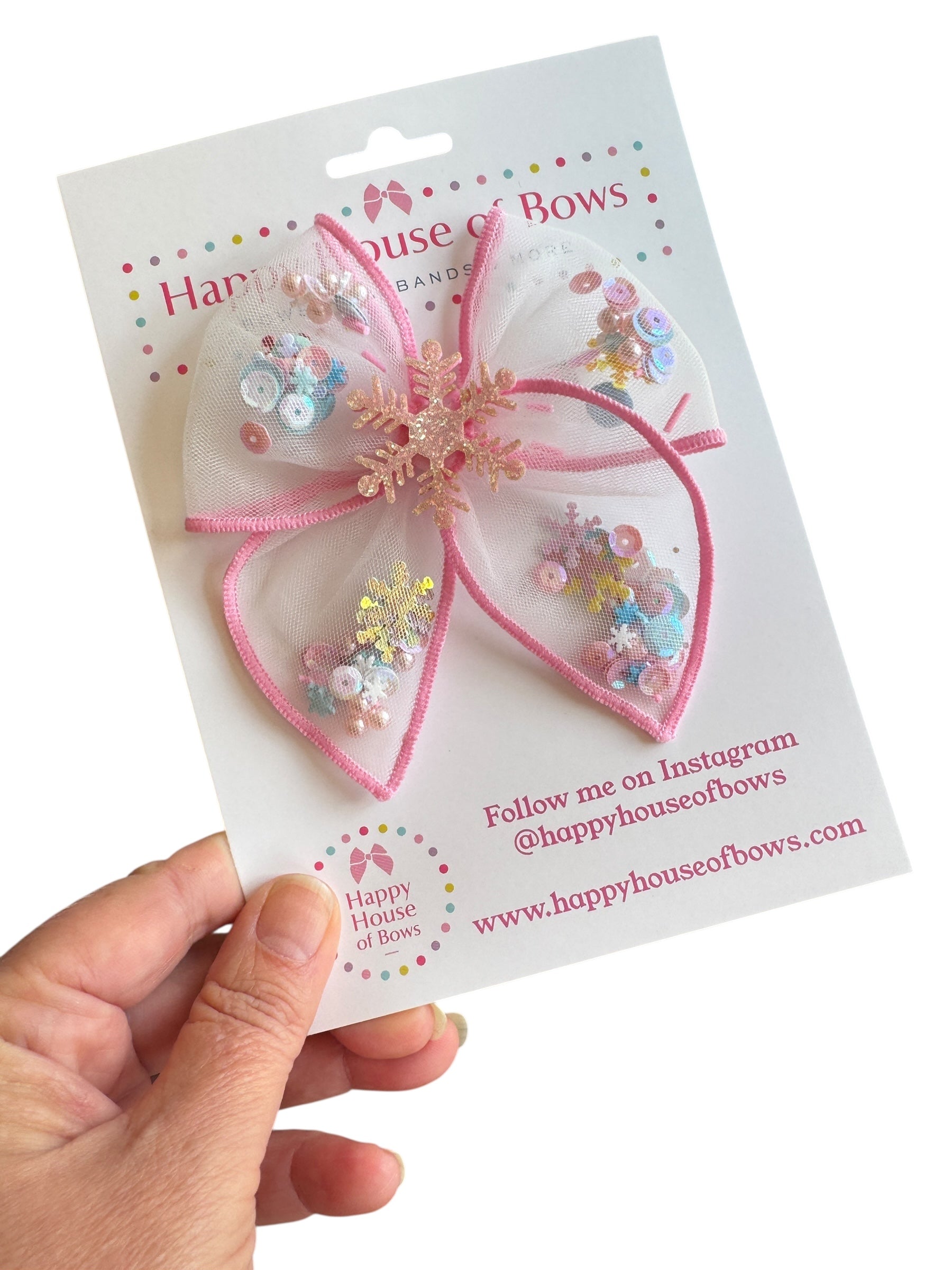 Pink Snowflake Shaker Hair Bows - Christmas Glitter Confetti Bows for Girls