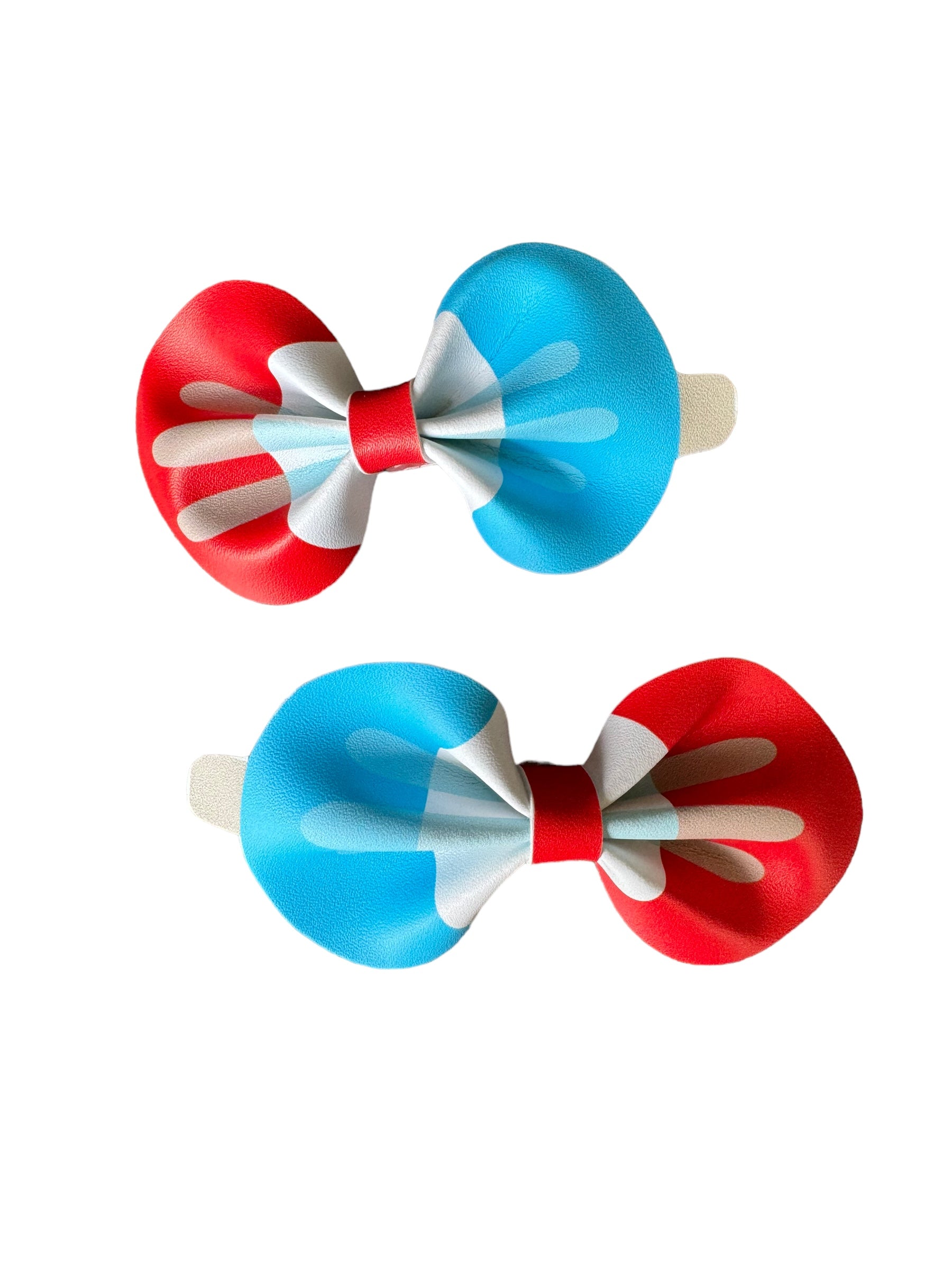 Add a pop of color and playfulness to any outfit with our Popsicle Faux Leather Bows! Featuring red, white, blue colors and vibrant bomb pop design, these bows are perfect for your summer patriotic events. The coordinating set adds convenience and style to your little one's wardrobe. (What's not to love?!)